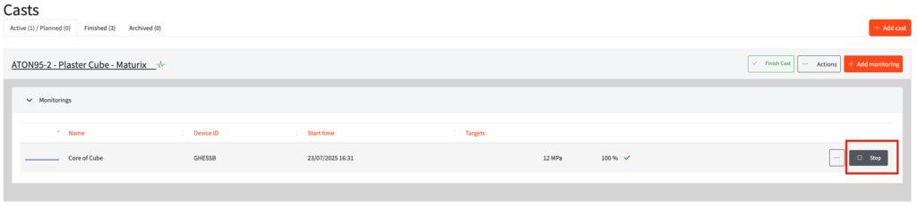 In this article, you will learn how you can start and stop monitorings. In the video below, we explain to you how to start a monitoring. To learn how to stop it and finish the cast report read the instructions below the video.